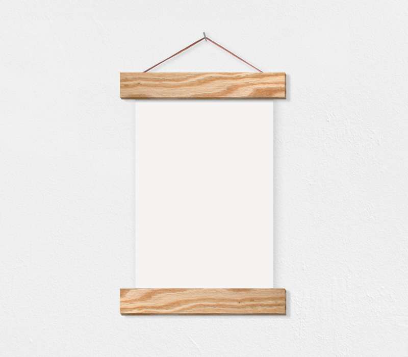 Canvas is attached to frame permanently. Frame has two oak wood pieces on top and two pieces on bottom. Each piece is approximately 1 - 1.25" tall and 1/4" thick. Frames come fully assembled with faux-leather cord ready for hanging. Hanging canvases come rolled like a scroll.